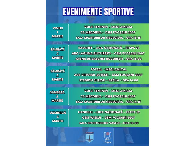 Vineri și sâmbătă, echipa de volei feminin a CSM Focșani 2007 va disputa două meciuri de pregătire în compania formației CS Medgidia. Primul partidă va avea loc vineri, 1 martie, și va începe la ora 13.15. Al doilea meci va avea loc duminică, 3 martie și va începe la ora 14.15.