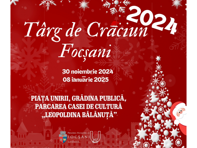„Sărbătorile de Iarnă 2024" vor fi organizate în perioada 30 noiembrie 2024 - 08 ianuarie 2025, în locațiile Piața Unirii, Grădina Publică, parcare Casa de Cultură „Leopoldina Bălănuță" din Municipiul Focșani.