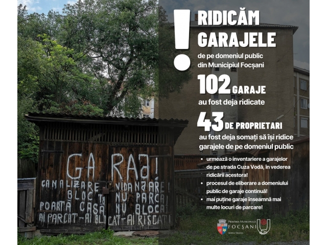 Începând cu săptămâna viitoare, inspectorii de specialitate din Primăria Municipiului Focșani vor demara o campanie de identificare a proprietarilor de garaje de pe Str. Cuza Vodă, în vederea notificării acestora și ulterior a eliberării domeniului public de garaje.