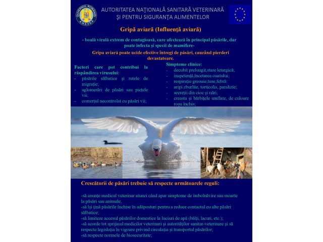 *În cazul apariției unor simptome de îmbolnăvire sau moarte la păsări sau animale, anunțați medicul veterinar!