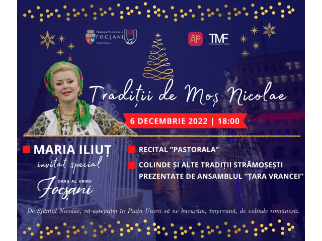 Pe 6 decembrie 2022, de Sfântul Nicolae, Primăria Municipiului Focșani, prin instituțiile de cultură din subordine, organizează în Piața Unirii, de la ora 18.00, un recital de colinde, susținut de Corul "Pastorala", dar și un concert folcloric oferit de artiștii Ansamblului Folcloric "Țara Vrancei".