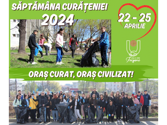 "Săptămâna Curățeniei" va fi deschisă de elevii colegiilor "Mihail Kogălniceanu" , "Spiru Haret", "Ion Mincu" si "Gheorghe Asachi", care vor beneficia de suportul logistic al colegilor noștri de la Direcția de Dezvoltare Servicii Publice Focșani.