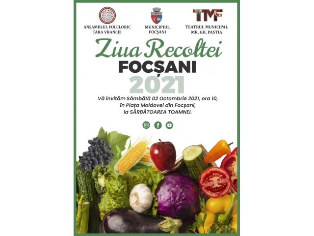Primăria Municipiului Focșani, împreună cu Administrația Piețelor Focșani, Ansamblul Folcloric „Țara Vrancei" și Teatrul Municipal „Maior Gh. Pastia", organizează și în acest an Ziua Recoltei, sărbătoare dedicată producătorilor și comercianților locali de legume, fructe și produse din carne și brânzeturi.