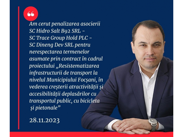 Primarul Municipiului Focșani, Cristi Valentin Misăilă, a solicitat, astăzi, 28 noiembrie 2023, penalizarea asocierii SC Hidro Salt B92 SRL - SC Trace Group Hold PLC - SC Dineng Dev SRL pentru nerespectarea termenelor asumate prin contract în cadrul proiectului „Resistematizarea infrastructurii de transport la nivelul Municipiului Focșani, în vederea creșterii atractivității și accesibilității deplasărilor cu transportul public, cu bicicleta și pietonale". Decizia a fost luată din cauza întârzierilor foarte mari la lucrările aflate în execuție în cadrul acestui proiect cu finanțare europeană. Deși au fost stabilite termene clare de finalizare pentru fiecare stradă, acestea nu au fost respectate. Mai mult, constructorul a solicitat sistarea lucrărilor care nu pot fi executate din cauza condițiilor meteo nefavorabile.
