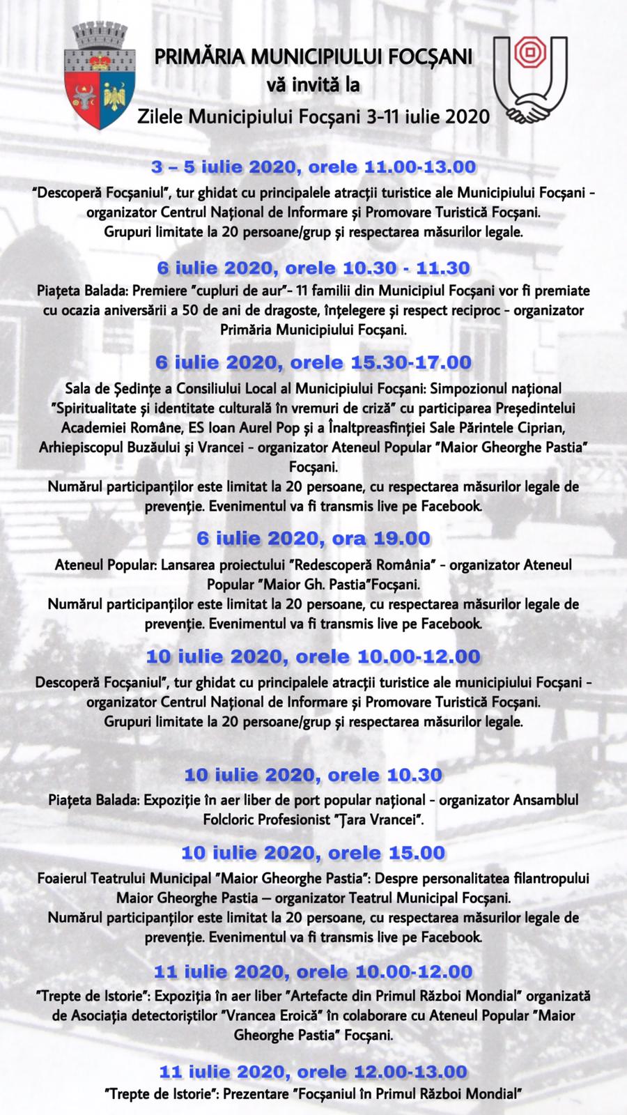 Programul ZILELOR MUNICIPIULUI FOCȘANI 3 - 11 iulie 2020