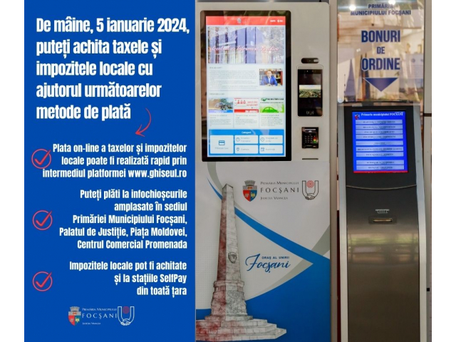 De mâine, 5 ianuarie 2024, puteți evita cozile la ghișee și achita atât on-line taxele și impozitele locale dar și cu ajutorul următoarelor metode de plată implementate de Primăria Municipiului Focșani.