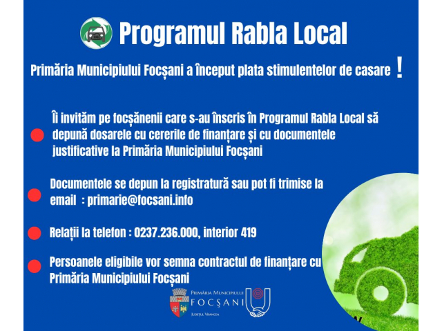 Prin intermediul Programului Rabla Local se dorește eliminarea din circulație a rablelor din Municipiul Focșani care au o vechime mai mare de 15 ani și norma de poluare Euro 3 sau inferioară. După radierea autoturismelor, proprietarii acestora vor primi câte 3.000 de lei.