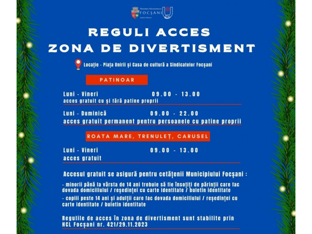 Accesul cetățenilor Municipiului Focșani la echipamentele din zona de divertisment amenajată în Piața Unirii și în parcarea de la Casa de Cultură a Sindicatelor din Focșani se face în baza regulilor stabilite prin HCL Focșani nr. 421/29.11.2023