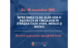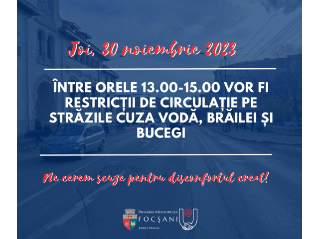 Mâine, 30 noiembrie 2023, între orele 13.00-15.00 vor fi restricții de circulație pe străzile Cuza Vodă, Brăilei și Bucegi