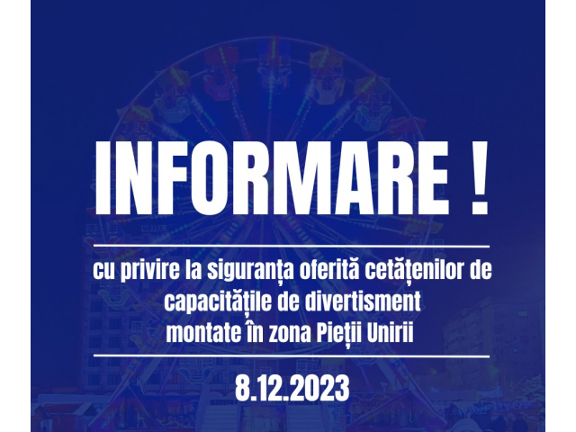 Pe de altă parte, aducem la cunoștința cetățenilor că responsabilitatea montării și gestionării acestei roți panoramice, dar și a celorlalte capacități de divertisment montate în zona Pieței Unirii aparține exclusiv operatorului economic care le deține.