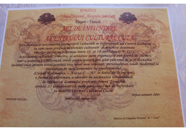 Inființarea Centrului Cultural al Colegiului Național "Alexandru Ioan Cuza" - 23 ianuarie 2018