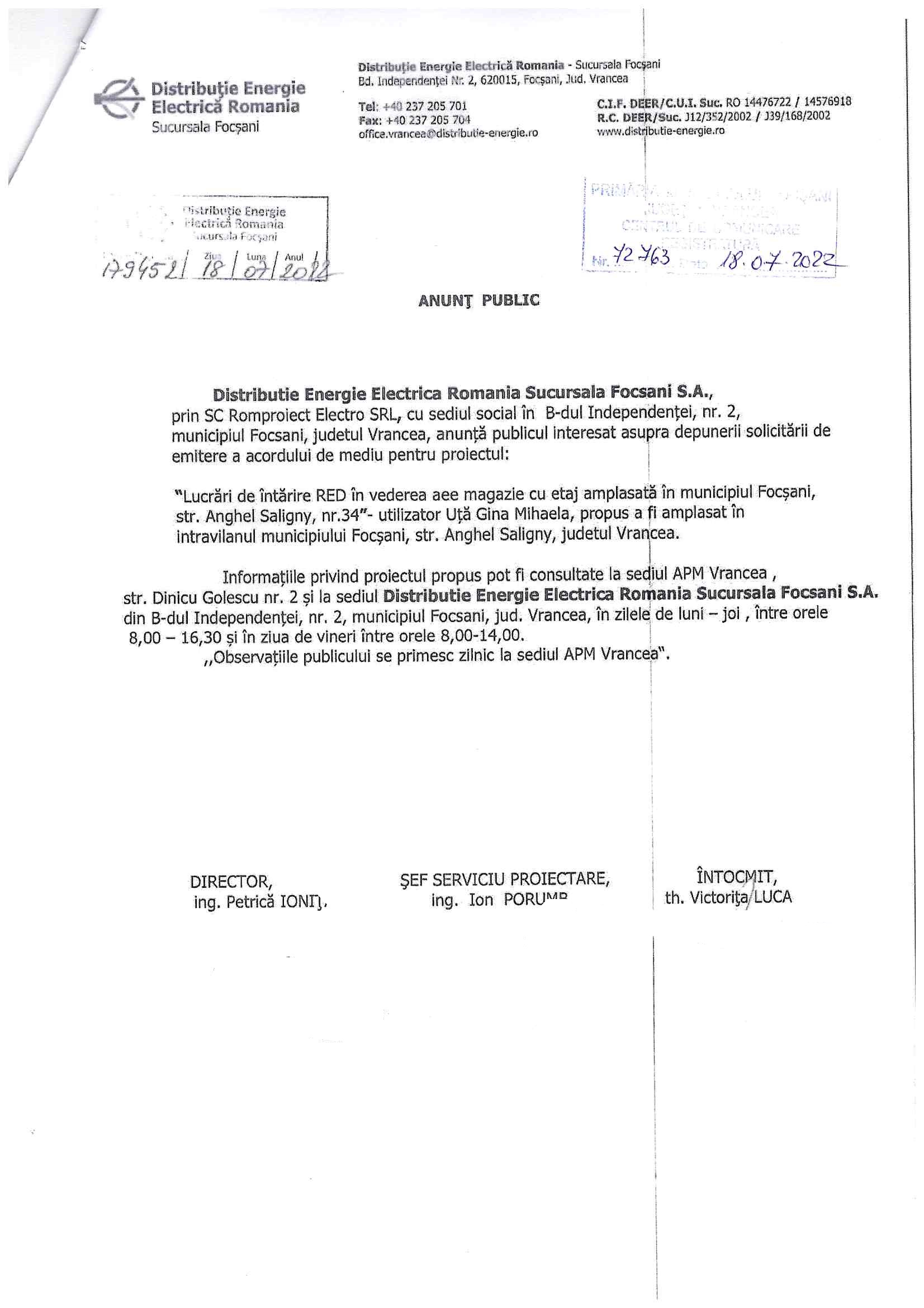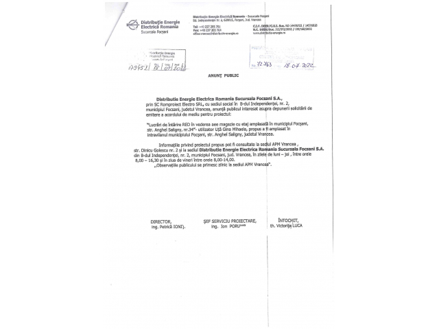 - Înființare centre de colectare prin aport voluntar în municipiul Focșani (Etapa de încadrare)