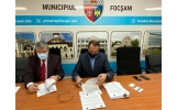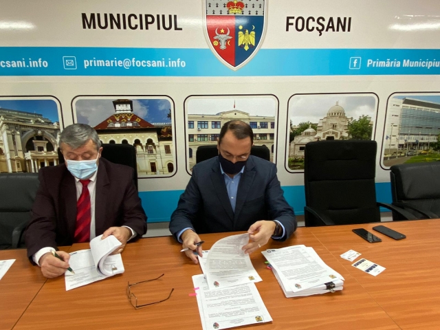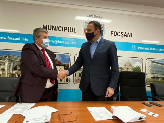 Primarul Municipiului Focșani, Cristi Valentin Misăilă și Deugene Băiculescu, reprezentantul asocierii SC Hidro Salt B92 SRL - SC Trace Group Hold PLC - SC Dineng Dev SRL, au semnat vineri, 27 noiembrie 2020, contractul de proiectare și execuție lucrări în cadrul proiectului european "Resistematizarea infrastructurii de transport la nivelul Municipiului Focșani în vederea creșterii atractivității și accesibilității deplasărilor cu transportul public, cu bicicleta și pietonale".