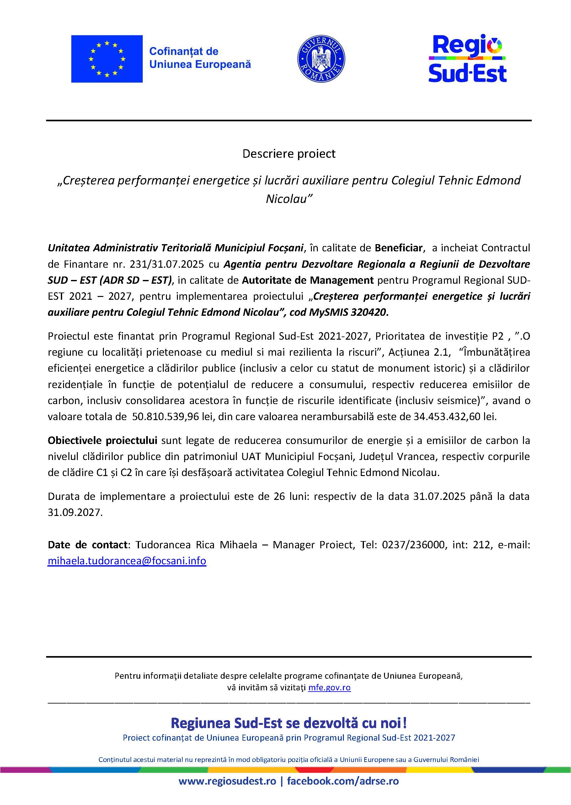 Anunț privind implementarea proiectului „Creșterea performanței energetice și lucrări auxiliare pentru Colegiul Tehnic Edmond Nicolau”