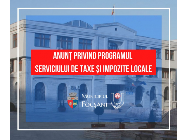 Serviciul de impozite și taxe locale, din cadrul Primăriei Municipiului Focșani, vine în spijinul cetăţenilor, astfel programul de funcţionare în perioada 21.08.2023-25.08.2023 este următorul: