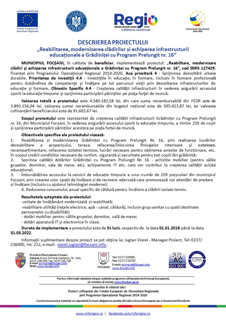Anunt privind descrierea proiectului „Reabilitarea, modernizarea clădirilor și echiparea infrastructurii educaționale a Grădiniței cu Program Prelungit nr. 16“