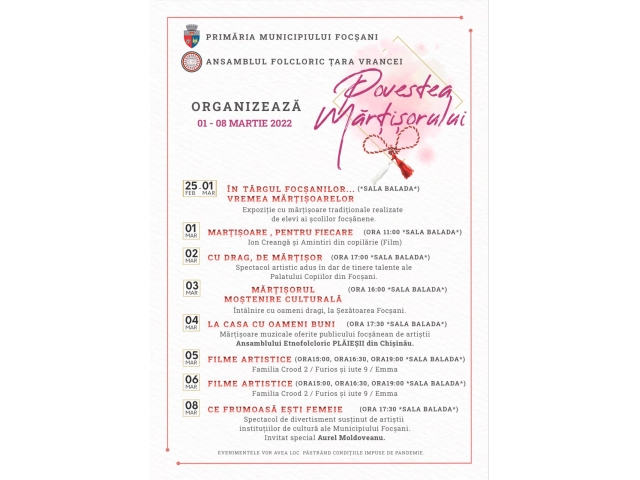 Astfel, în perioada 25.02-01.03.2022 la Sala Balada dar și în Piațeta Balada va fi organizată o expoziție de mărțișoare hand-made realizate de elevi ai școlilor focșănene "În târgul Focșanilor...vremea mărțișoarelor", iar pe data de 1 martie 2022, de la ora 11.00 la Sala Balada va fi proiectat filmul "Ion Creangă și Amintiri din copilărie".