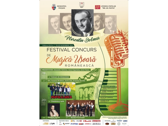 Organizată de Ateneul Popular "Maior Gh. Pastia", cea de-a 46 ediție a Festivalului de Muzică Ușoară Românească "FLORENTIN DELMAR" începe vineri, 19 noiembrie 2021, la ora 18.00, când 17 tineri din toată țara îi vor încânta pe cei prezenți, în speranța că vor obține marele premiu! Îi veți putea auzi astfel în prima zi a festivalului, în cadrul "Concursului de interpretare", după care organizatorii v-au pregătit un recital de excepție. Pe scena Ateneului va urca, de la ora 20.00, trupa "POPFOLKLORICA", un proiect româno-norvegian, o combinație de muzică pop, jazz, blues, motown, soul, cu elemente etno și de folclor autentic, care îi reunesc, în premieră, pe Ovi și Frații Cazanoi.