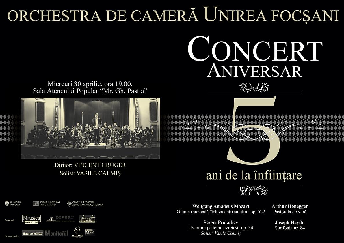 Concertul lunii aprilie este unul special pentru noi, deoarece orchestra noastră împlineşte 5 ani de la înfiinţare. Reamintim că Orchestra de cameră „UNIREA" - formaţie instrumentală profesionistă, a fost înfiinţată în 2009 prin proiectul cultural Rinascimento Musici, proiect finanţat de Ministerul Culturii prin Fondul Cultural Naţional. De atunci şi până în prezent, orchestra a susţinut peste 40 de concerte, atât la Focşani cât şi la Iaşi, Galaţi, Buzău, Adjud şi Bucureşti.