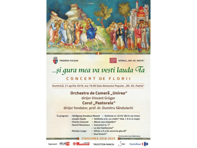 Duminică, 21 aprilie 2019, ora 19:00, pe scena Ateneului Popular „Mr. Gh. Pastia" va avea loc un concert cu tematică pascală, „...şi gura mea va vesti lauda Ta". Concertul va fi oferit de Orchestra de cameră UNIREA Focşani şi Corul PASTORALA, cu ocazia Sărbătorii de Florii. Cei doi dirijori, deja cunoscuţi, sunt Vincent Gruger şi Dumitru Săndulachi.