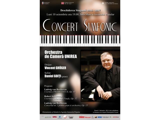 Avem plăcerea de a vă invita să luaţi parte la concertul simfonic al Orchestrei de Cameră UNIREA în deschiderea celei de a VIII-a stagiuni, 2016 - 2017, ce va avea loc pe 10 octombrie, cu începere de la ora 19.00, la Sala mare a Ateneului Popular "Mr Gh.Pastia".
