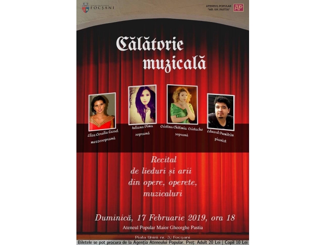 Primul eveniment muzical al lunii ce va avea loc în data de 17.02.2019, ora 18:00, va reuni patru artişti tineri, care prin talentul lor vor încerca să transmită spre inimile auditoriului din Focşani, o serie de lucrări muzicale ale marilor compozitori ai lumii: PTR. I.CEAIKOVSKI, J. OFFENBACH, G. BIZET, FRANZ LEHAR, FREDERICK LOEWE, HENRY PURCELL, GEORGE GRIGORIU, ş.a.