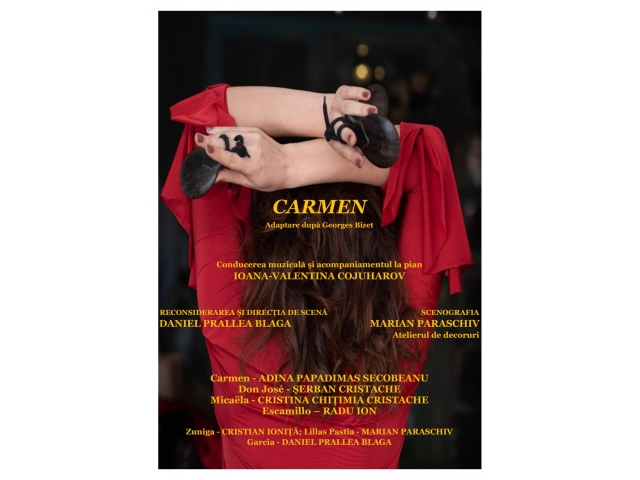 Sub conducere muzicală şi acompaniament la pian a talentatei IOANA-VALENTINA COJUHAROV vor evolua - ADINA PAPADIMAS SECOBEANU în rolul lui Carmen, ŞERBAN CRISTACHE în rolul lui Don Jose, CRISTINA CHIŢIMIA CRISTACHE în rolul Micaelei şi RADU ION în rolul lui Escamillo.
