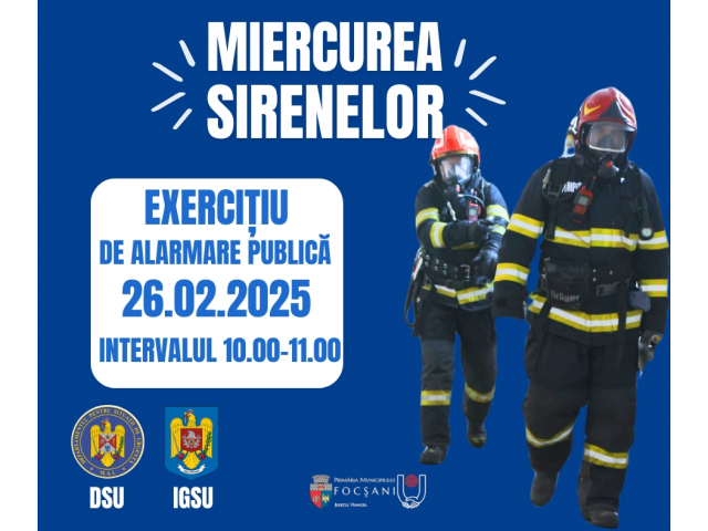 Primăria Municipiului Focșani, prin Compartimentul Protecție Civilă, Situații de Urgență, anunță cetățenii, instituțiile publice și operatorii economici din oraș că în data de 26 februarie 2025, în intervalul orar 10.00 -11.00, Inspectoratul pentru Situații de Urgență Vrancea organizează și desfașoară antrenamentul/exercițiul de alarmare publică, denumit generic "Miercurea Sirenelor".