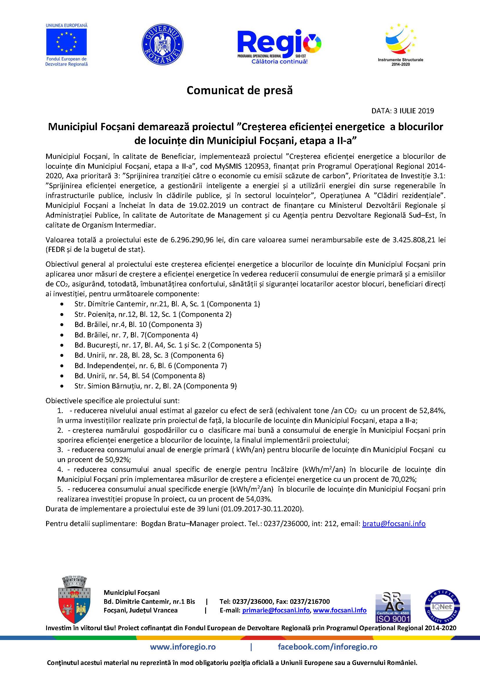 Municipiul Focșani demarează proiectul ”Creșterea eficienței energetice  a blocurilor de locuințe din Municipiul Focșani, etapa a II-a”
