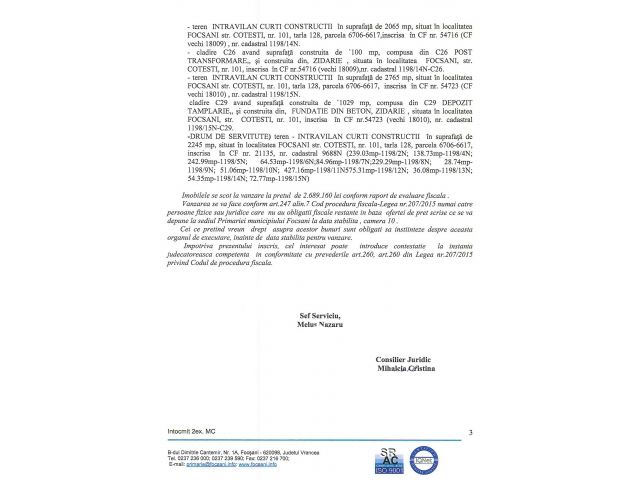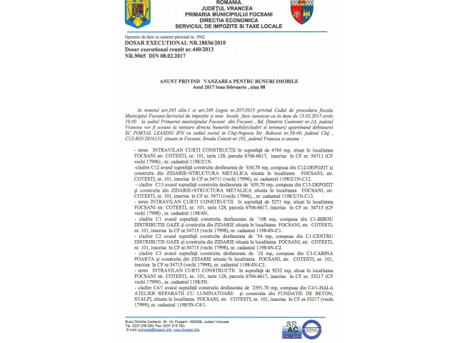 Este publicat anunțul de vânzare pe site-ul instituției prin care Primăria Municipiului Focșani anunță vânzarea bunurilor proprietatea S.C. PORTAL LEASING IFN la licitatie publică, iar după expirarea termenului prevăzut de lege se prezintă un singur ofertant care oferă prețul de 1.350.000 lei.