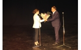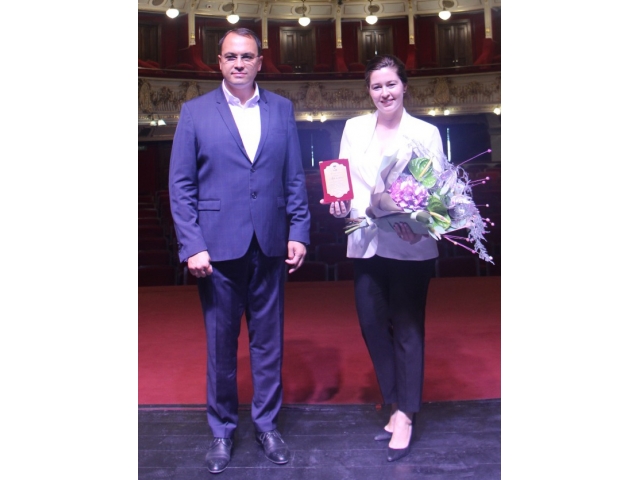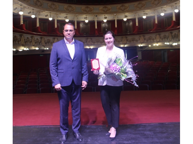 Interpreta Reginei Maria din filmul "Maria, Regina României" a urcat pe scena teatrului focșănean în aplauzele celor prezenți și a primit din partea Primarului Municipiului Focșani o plachetă și un buchet de flori, ca o recunoaștere a faptului că Premiul pentru interpretare feminină al Uniunii Cineaștilor din România a ajuns la Focșani.
