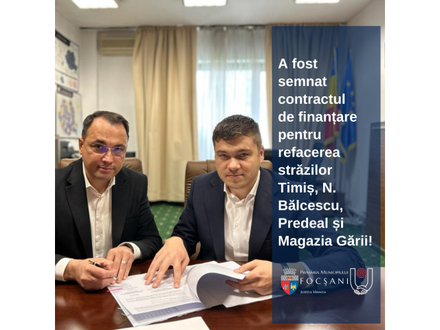 Primarul Municipiului Focșani Cristi Valentin Misăilă a semnat astăzi, la sediul Ministerului Dezvoltării, Lucrărilor Publice și Administrației, contractul de finanțare pentru proiectul „Refacere infrastructură străzi, sistematizare verticală strada Timiș, strada Nicolae Bălcescu, strada Predeal (tronson cuprins între strada Ion Creangă și strada Grigore Ionescu) și reparații și așternere covoare asfaltice carosabil strada Magazia Gării", finanțat prin Programul Național de Investiții (PNI) "Anghel Saligny".