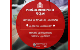 Serviciul de impozite și taxe locale, din cadrul Primăriei Municipiului Focșani, aduce la cunoştinţă persoanelor fizice si juridice programul de încasări, precum și programul ghiseelor de preluare a documentelor privind dobândirea sau înstrăinarea unui mijloc de transport, astfel :