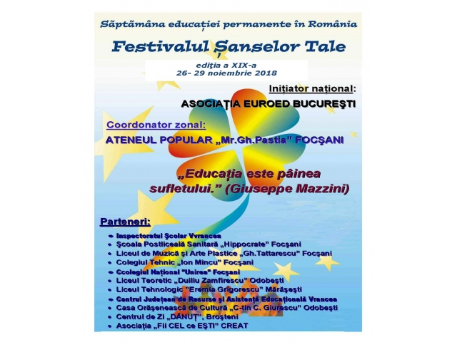 Evenimentele se încadrează totodată şi în a XIX-a ediţie a Festivalului Şanselor Tale - Săptămâna Educaţiei Permanente în România, festival naţional iniţiat de Asociaţia EUROED Bucureşti, cu scopul promovării educaţiei pe tot parcursul vieţii. Incă de la primele ediţii Ateneul Popular Focşani a fost desemnat coordonator zonal al acestuia.