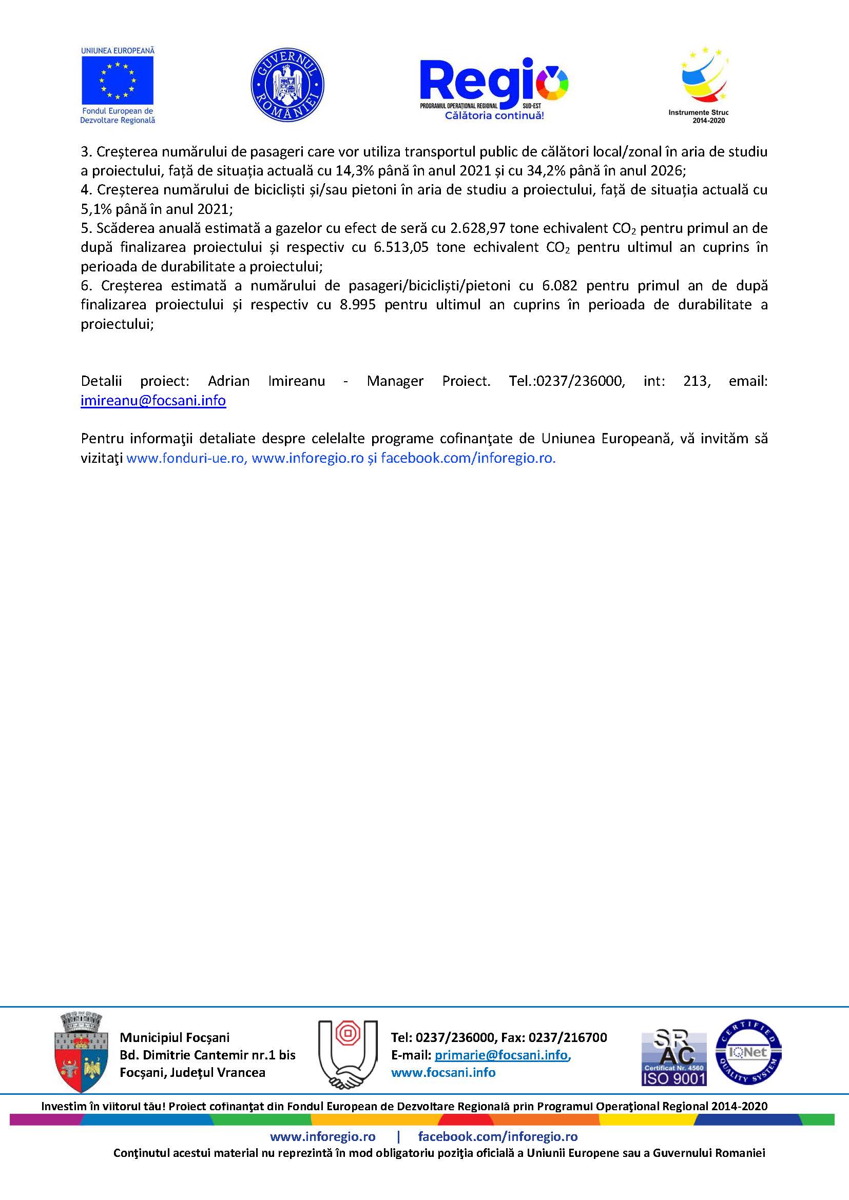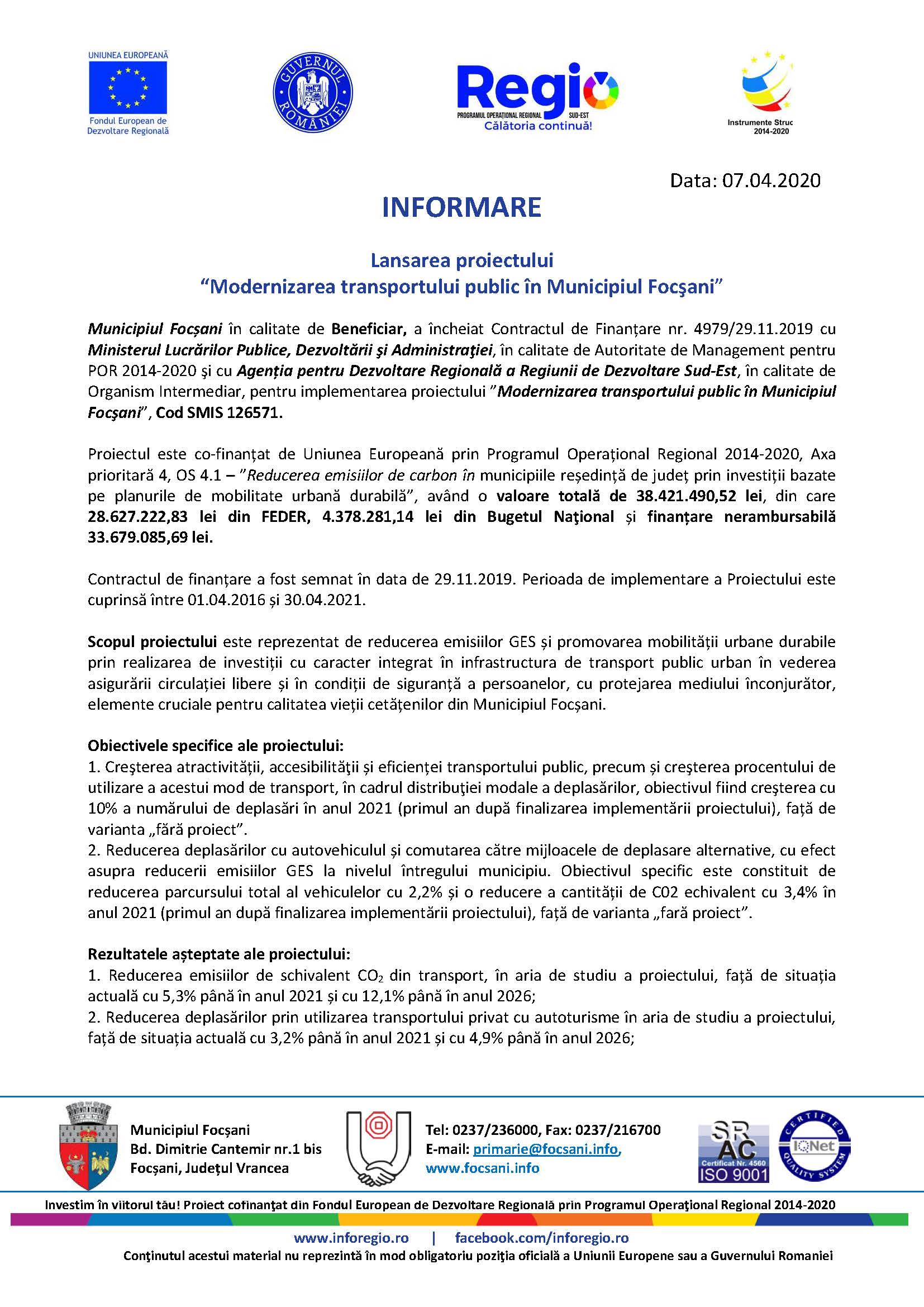 Informare privind lansarea proiectului “Modernizarea transportului public în Municipiul Focşani”