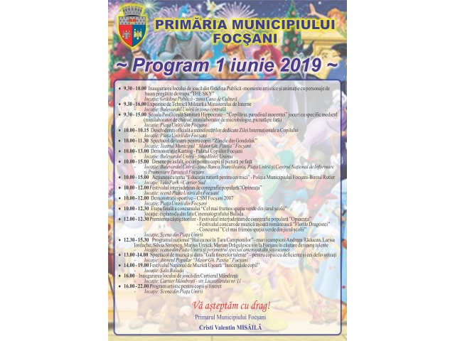 Dragi copii, de 1 iunie, vă invit să vă luați frații, părinții, bunicii și profesorii și să veniți cu toții în Piața Unirii din Focșani pentru a sărbători împreună cea mai frumoasă zi - Ziua Internațională a Copilului!