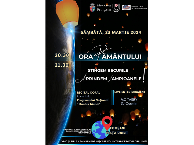 Pe această cale, îi invităm pe toți cetățenii Municipiului Focșani să vină în Piața Unirii pentru a marca împreună „Ora Pământului" și să stingă luminile în intervalul 20.30-21.30.