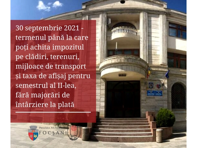 Primăria Municipiului Focşani informează în mod public persoanele fizice și juridice că data de 30 septembrie 2021 este termenul limită până la care se poate achita impozitul pe clădiri, terenuri, mijloace de transport și taxa de afișaj pentru semestrul al II-lea al anului 2021, fără majorări de întârziere la plată.