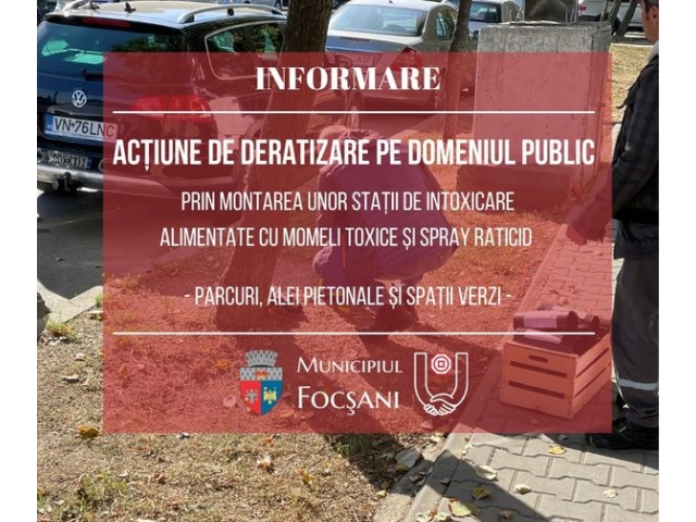 Primaria Municipiului Focsani a început o acțiune de deratizare pe domeniul public, prin montarea unor stații de intoxicare alimentate cu momeli toxice și spray raticid.