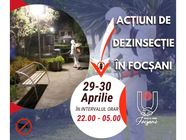 Primăria Focșani, prin Direcția de Dezvoltare Servicii Publice, va efectua, în perioada 29 - 30 Aprilie 2024, o acţiune de dezinsecție pe raza Municipiului Focșani, pentru a înlătura insectele dăunătoare și pentru a preveni răspândirea lor.