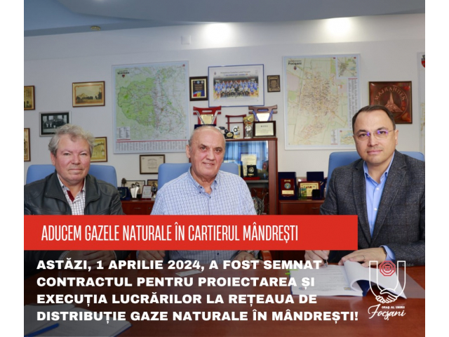 Primarul Municipiului Focșani, Cristi Valentin Misăilă, a semnat, astăzi, 1 aprilie 2024, contractul pentru proiectarea și execuția lucrărilor la rețeaua de distribuție gaze naturale în Cartierul Mândrești.