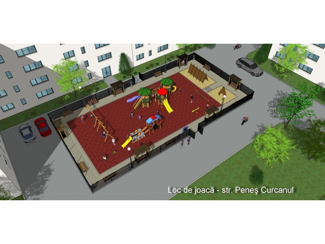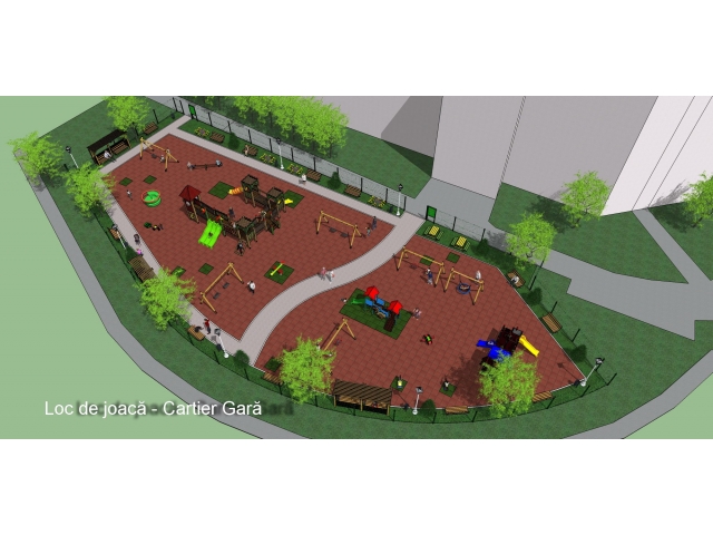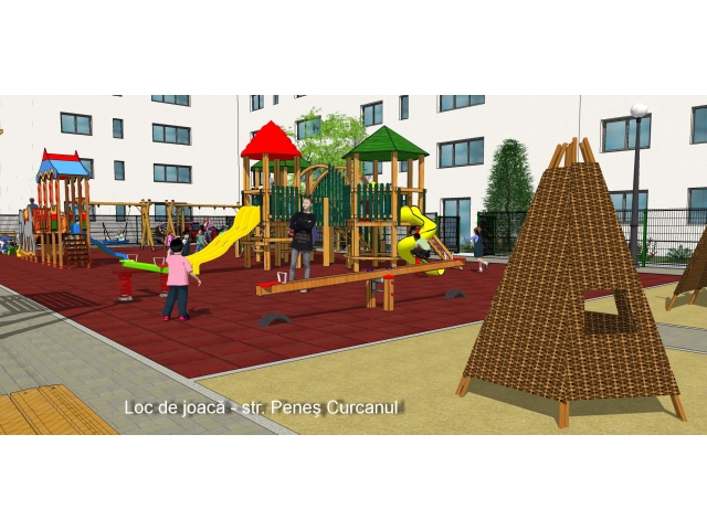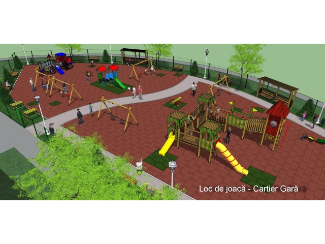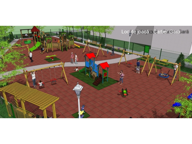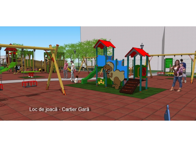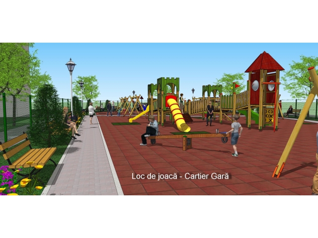Locurile de joacă vor fi montate pe un covor de cauciuc special creat pentru a proteja copii împotriva loviturilor și vor fi prevăzute cu spații verzi, leagăne, tobogane, balansoare, băncuțe din lemn pe suport metalic, pergole din lemn pentru parinti, coșuri de gunoi, panouri informative si alte echipamente specifice.