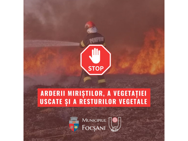 Având în vedere adresa Comitetului Județean pentru Situații de Urgență Vrancea înregistrată la Primăria Municipiului Focșani, vă aducem la cunoștință faptul că este interzisă arderea miriștilor, a vegetației uscate și a resturilor vegetale existente pe terenurile arabile, inclusiv pe terenurile lăsate pârloagă, cât și a suprafețelor de pajiști permanente.