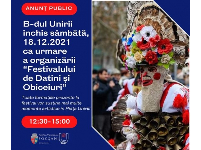Vă informăm că în data de 18 decembrie 2021, în intervalul orar 12.30-15.00, B-dul Unirii va fi închis circulației pe tronsonul dintre intersecția cu Strada Unirea Principatelor până la intersecția cu Strada Ștefan cel Mare, ca urmare a faptului că la sediul Ansamblului Folcloric „Țara Vrancei" se va desfășura Festivalul de Datini și Obiceiuri.