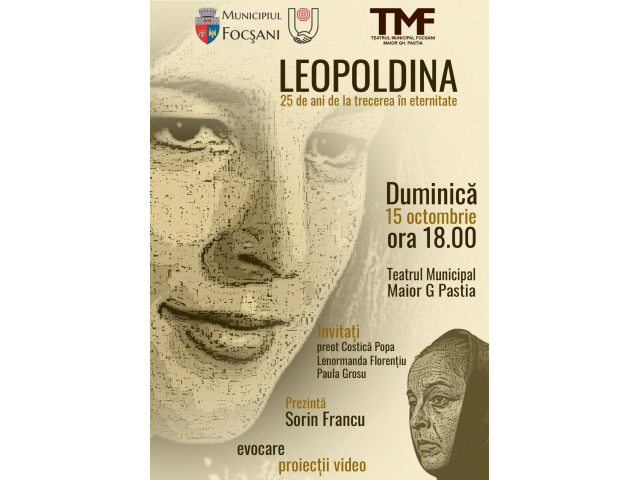 Primăria Municipiului Focșani vă invită, duminică, 15 octombrie, la Teatrul Municipal „Maior Gh. Pastia" la o evocare a actriței Leopoldina Bălănuță (1934-1998), tragica doamnă a teatrului românesc.