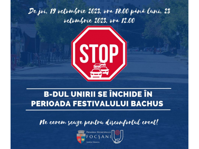 Bulevardul Unirii va fi închis în zona Pieței Unirii, de joi, 19 octombrie 2023, începând cu ora 18.00, până luni, 23 octombrie, ora 12.00, în perioada desfășurării evenimentelor organizate în cadrul Festivalului Internațional al Viei și Vinului Bachus - 2023.