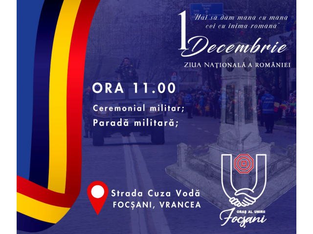 Primăria Municipiului Focșani vă invită să participați la ceremonia militară care va fi organizată cu prilejul sărbătoririi Zilei Naționale a României pe data de 1 Decembrie, de la ora 11.00.