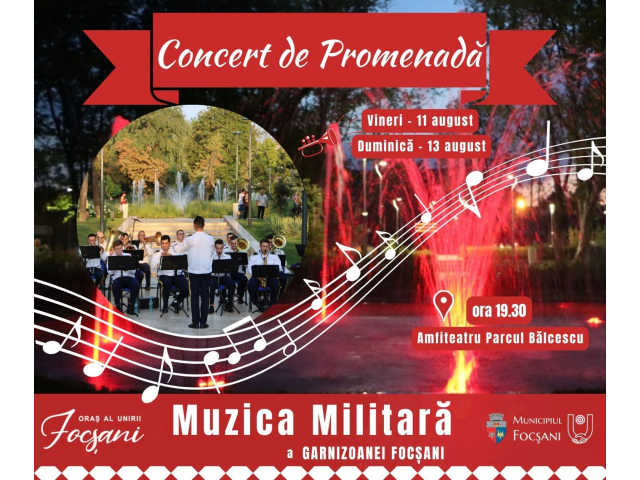 Întâlnirile cu Muzica Militară a Garnizoanei Focșani sunt programate pentru vineri - 11 august și duminică - 13 august, de la ora 19,30, în atmosfera deosebită de la Amfiteatrul parcului Nicolae Bălcescu.