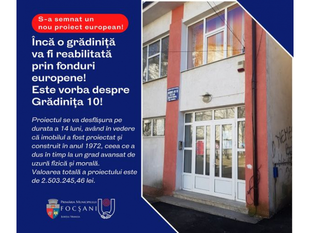 A fost semnat și contractul de finanțare pentru proiectul european „Reabilitarea, modernizarea și echiparea infrastructurii educaționale a Grădiniței nr. 10", în valoare totală de 2.503.245,46 lei.