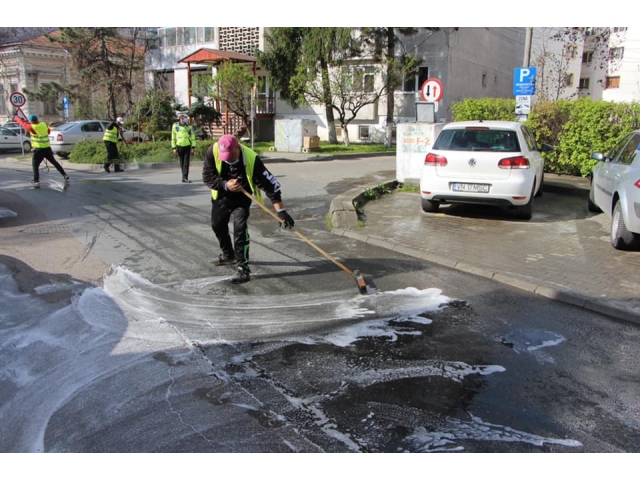 Beneficiind de sprijinul Poliției Locale, care a restricționat accesul autovehiculelor pe perioada intervențiilor, autospeciala de la CUP Salubritate, urmată de angajații serviciului, a intrat pe străzile Mihail Kogălniceanu, Simion Bărnuțiu și în zona din fața Hotelului Vrancea, pentru degresarea arterelor respective.